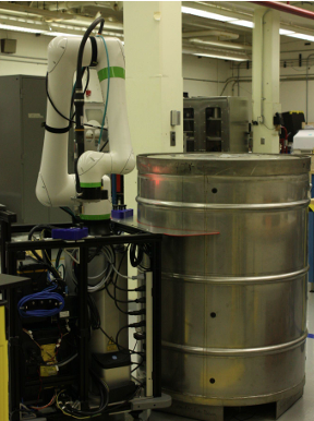 The prototype described in this paper is contained on a custom-designed modular cart constructed from 38.1 mm (1.5in) 80/20 construction rail. The cart includes two semi-circular aligning plates with radii that correspond to the outer dimensions of the drum and CV, allowing the cart system to be wheeled flush with the containers for consistent manual alignment. On a basic level, the MADBUS bolting procedure operates as follows. Upon startup of the system with LabVIEW™,a, a lift initializes and raises a robotic arm to an appropriate height to reach the container bolts. The arm actuates and positions a magnetized nutrunner socket over a particular bolt in the cart’s bolt management module (BMM). The arm moves to accept a bolt head into its magnetized socket and unscrew the bolt from its holder. With a bolt held in the socket, a machine vision camera identifies empty bolt holes in the drum. The arm then positions the socket with bolt over the hole and descends the end effector into position. The nutrunner tightens the bolt to a specified torque. The arm moves back into position to retrieve the next bolt in the BMM, and the process repeats for the next bolt in the star-shaped bolting pattern. The outer drum bolt tightening requires two passes of increasing torque to get to its final specification. Conversely, the unbolting process starts with the camera identifying a bolt head in the container flange, which the nutrunner loosens. The freed bolt is lifted with the magnetic socket and screwed into its place in the BMM. This process repeats around the container.