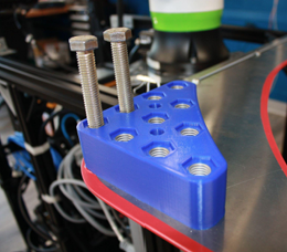 To store bolts that have been removed from the container, the system features bolt management modules (BMMs), Figure 3, with threaded holes that removed bolts can be torqued into for later use (e.g. for container assembly). This satisfies the third requirement. These BMMs are also easily detachable (fastened with 2 bolts) so that after a container has been disassembled, the BMMs can be taken off the MADBUS system. The MADBUS system can now be used to disassemble another container. When a container needs to be reassembled, the BMMs for that container can then be reattached. This allows the MADBUS system to assemble and disassemble containers quickly and keep bolts removed from containers organized
