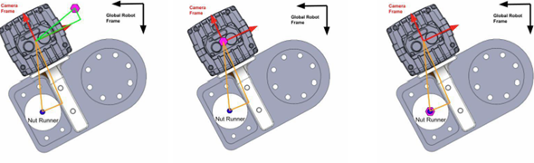 Once the bolt has been aligned with the camera, the nutrunner is a fixed offset from the center of the camera in the camera frame. Using a very similar process to that outlined above, this offset can be transformed into the black global frame and the bolt can be aligned with the nutrunner as shown in the right image of Figure 6.