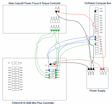 The FANUC® controller’s digital output board is utilized to send signals to both the nutrunner’s torque controller and the lift’s compute box, each of which have a dedicated digital input board. Concerted operation of the lift and nutrunner rely on digital I/O signals from the FANUC®, executed from the LabVIEW™ code. Further details on their operation can be found in the Control of Atlas Copco® Nutrunner Section and Control of OnRobot® Lift Section, respectively. A basic I/O wiring diagram for the MADBUS system is provided in Figure 7.