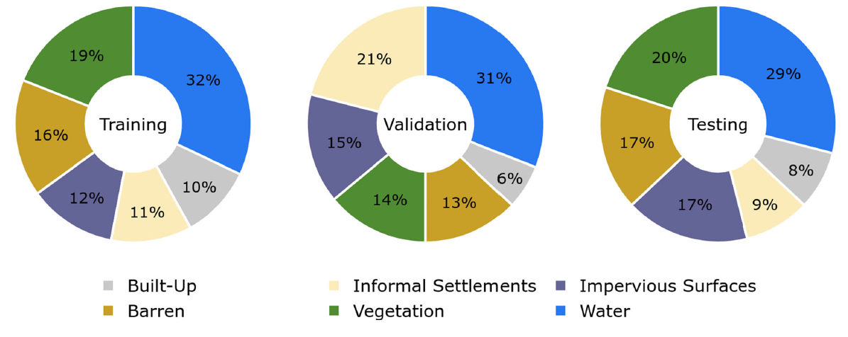 The dataset explored in this project is the Manually Annotated High Resolution Satellite Image Dataset of Mumbai for Semantic Segmentation (missing reference). The dataset was created from high-resolution, true-color satellite imagery of Pleiades-1A acquired on March 15, 2017 over Mumbai. There are six classifications: vegetation, built-up areas, informal settlements, impervious surfaces (roads, streets, parking lots, etc.), barren land, water, and a small number of unclassified pixels. The exact pixel distribution for the training set is given in Table 1.