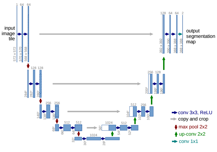 Ronneberger, Fischer, and Brox proposed the first U-Net architecture to segment cells in microscopic images (Ronneberger et al., 2015). The symmetric model consists of a contracting path, or encoder, on the left half and an expanding path, or decoder, on the right half. In the encoder, each level applies a $3\times 3$ convolution with ReLU activation before a $2\times 2$ max pooling operation is applied with stride 2 which reduces spatial dimensions by half. By doing this, the encoder is learning increasingly abstract representations of the original image while downsampling for computational efficiency. The decoder starts with the lowest spatial resolution, most abstract features and performs a series of $2\times 2$ upconvolutions which doubles the spatial dimensions. Importantly, a skip connection from the encoder of equivalent spatial dimension to each decoder layer is included to preserve spatial information lost during downsampling. The final output layer performs a $1\times 1$ convolution that reduces the number of channels to the number of classes.