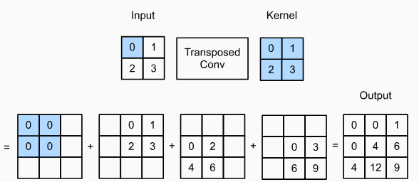 Transposed convolution, also known as upconvolution, is a method of upsampling similar to downsampling with convolution. Between each input pixel, zeros are inserted to increase the size of the feature map before convolution with the kernel. An example of transposed convolution is given below:
