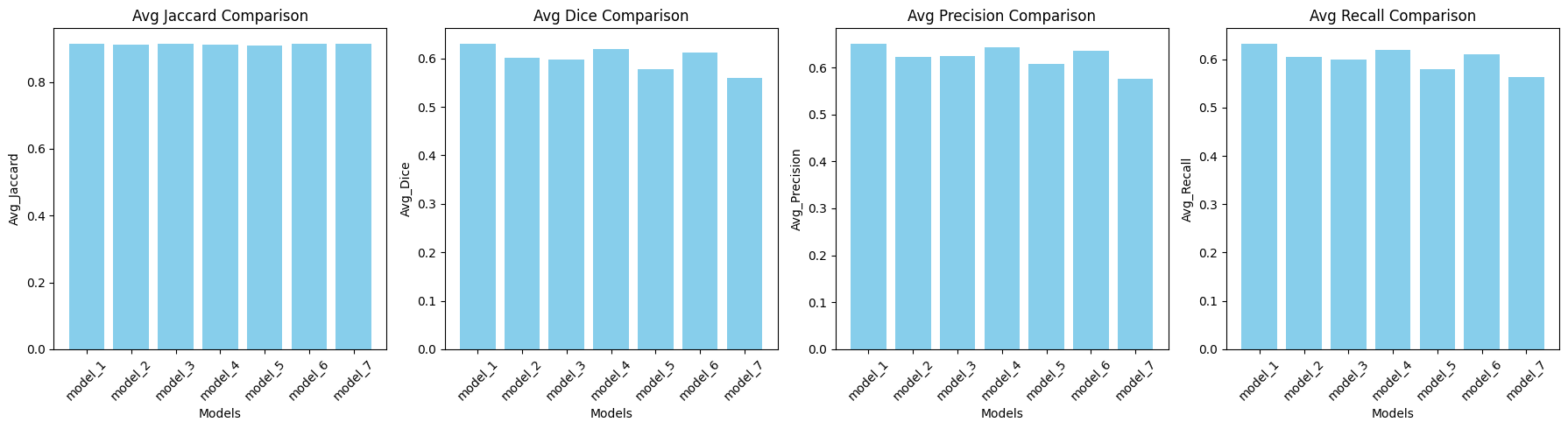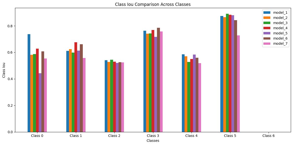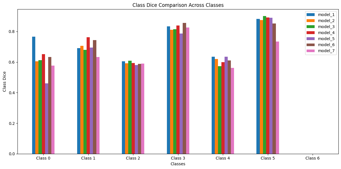 Model 1 stands out as the best-performing model overall. It consistently achieves the highest Dice and IoU scores for critical classes, while maintaining strong performance across other classes. Model 4 closely follows, excelling particularly in Class 1 and Class 3, where it outperforms other models. Model 6 also demonstrates strong performance, particularly in Class 3 and Class 5, where its inclusion of SCSE attention blocks helps improve feature focus and segmentation quality. While it falls slightly behind Models 1 and 4 in certain classes, it remains a reliable model with strong average Dice and IoU scores. On the other hand, Model 2 and Model 7 underperform.